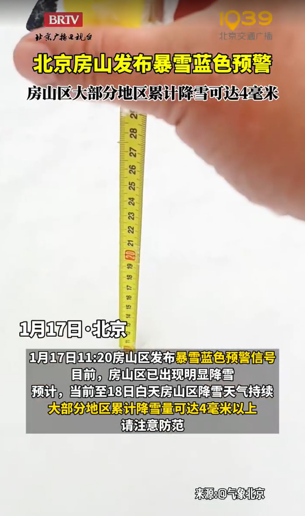 房山暴雪蓝色预警!雪量4毫米以上,出行请注意