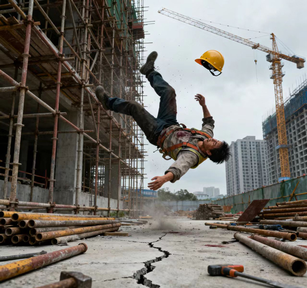 高空坠落陷阱 :脚手架松动、临边防护缺失,工友稍有不慎,就可能从高空坠落。坠落瞬间,身体像失控的重物,撞击地面或建筑物构件,骨折、颅脑损伤、内脏破裂风险陡增,伤害程度随坠落高度急剧上升。