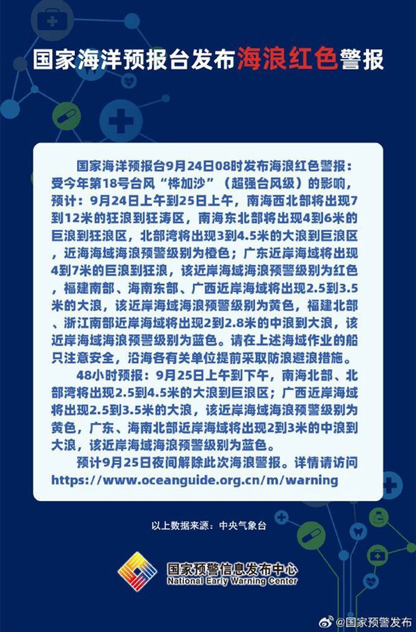 国家海洋预报台 9 月 24 日 08 时发布海浪红色警报:受今年第 18 号台风 “桦加沙”(超强台风级)的影响,预计:9 月 24 日上午到 25 日上午,南海西北部将出现 7 到 12 米的狂浪到狂涛区,南海东北部将出现 4 到 6 米的巨浪到狂浪区,北部湾将出现 3 到 4.5 米的大浪到巨浪区,近海海域海浪预警级别为橙色。